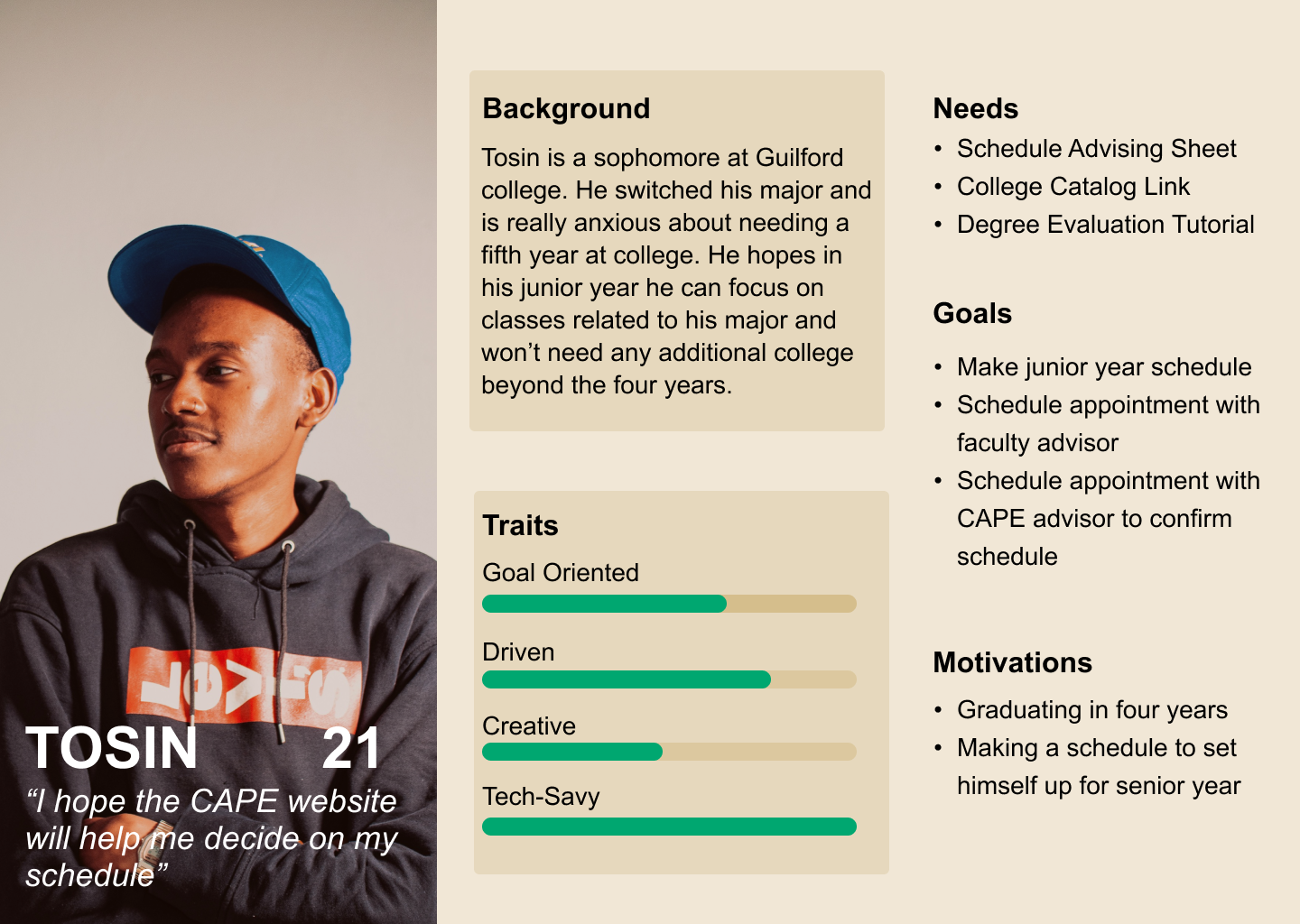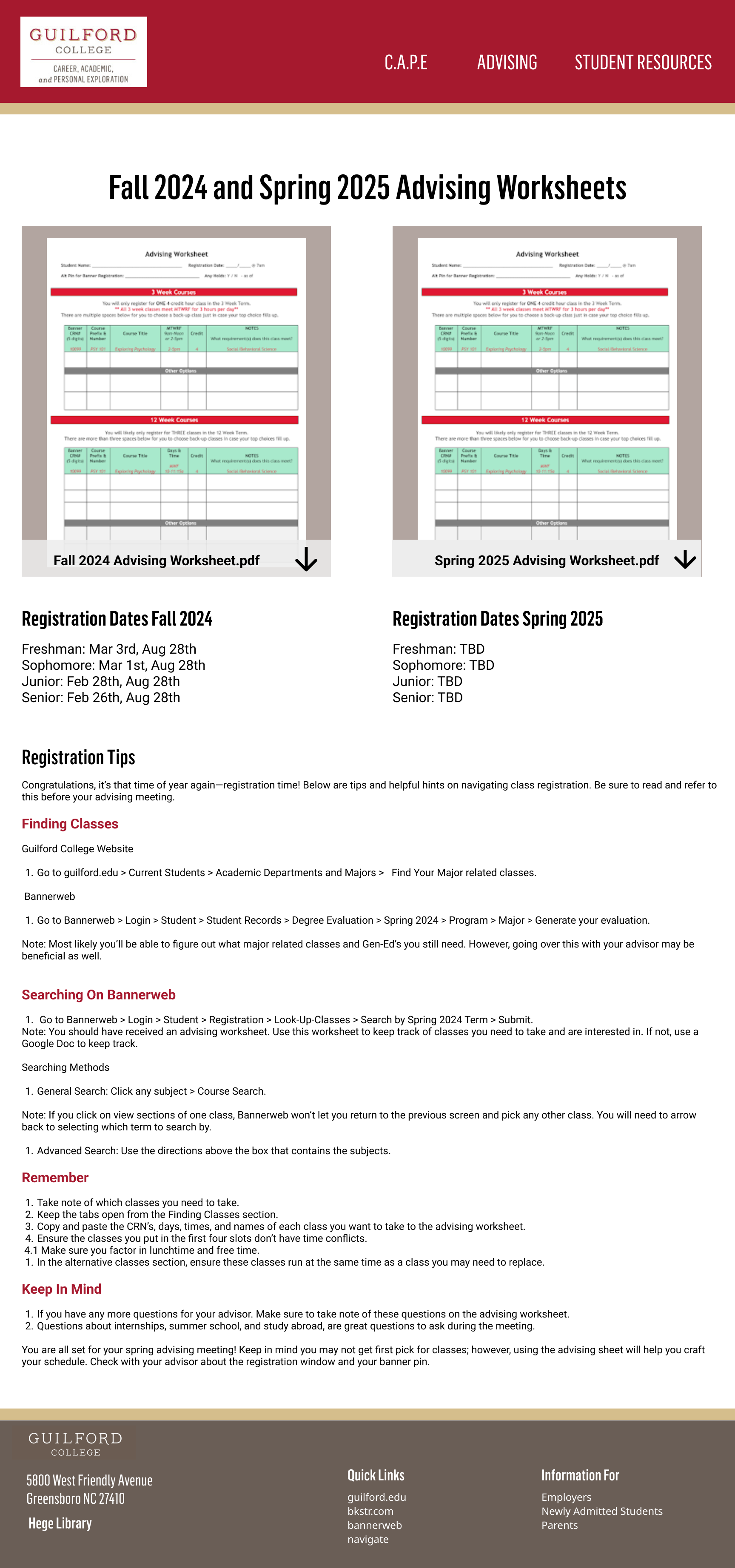 C.A.P.E stands for Career, Academic, and Personal Exploration. C.A.P.E advisors guide students through all three facets of their acronym through students' Guilford Journey. To Guilford College students, C.A.P.E advisors are way more than people who just help them pick their classes; C.A.P.E advisors guide students through the transition from undergraduate to graduate and beyond.